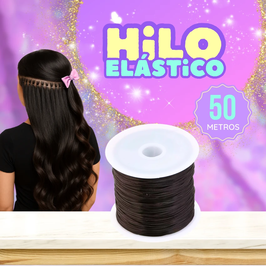 Hilo elástico resistente de 50 metros, ideal para trabajos de peinado, trenzas, extensiones y sujeción precisa. Flexible, duradero y fácil de manejar en uso profesional o personal.