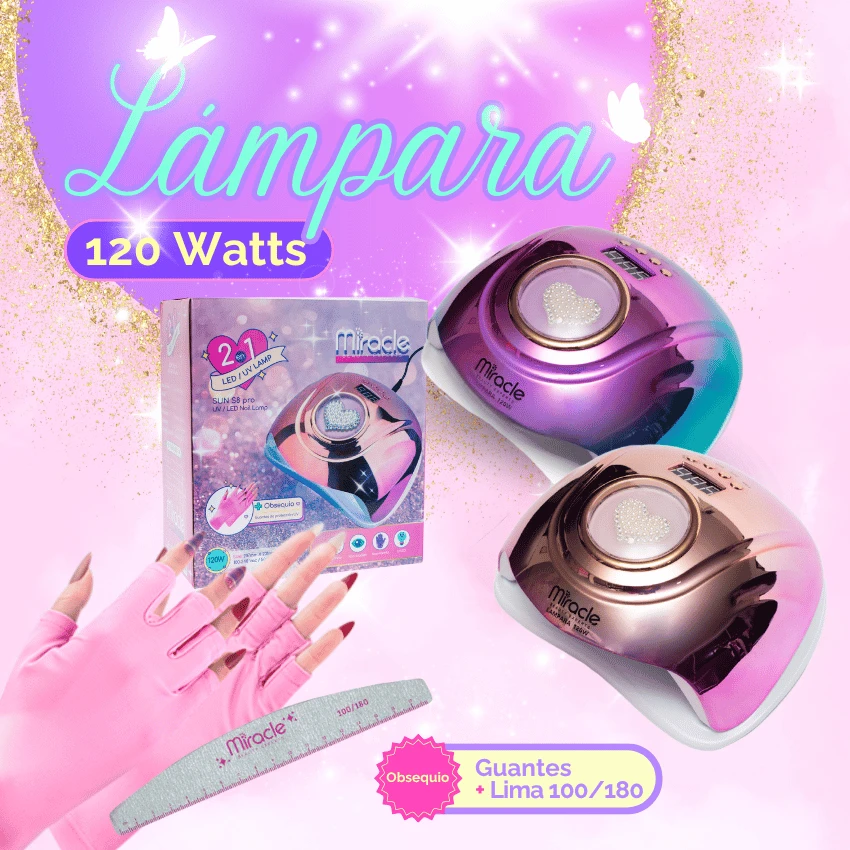 Lámpara UV/LED de alta potencia ideal para curar geles de forma rápida y uniforme. Su diseño en tonos metálicos le da un acabado moderno y elegante. Incluye guantes protectores y lima 100/180 para un trabajo más seguro y profesional. Perfecta para manicure y pedicure en salón o uso personal.