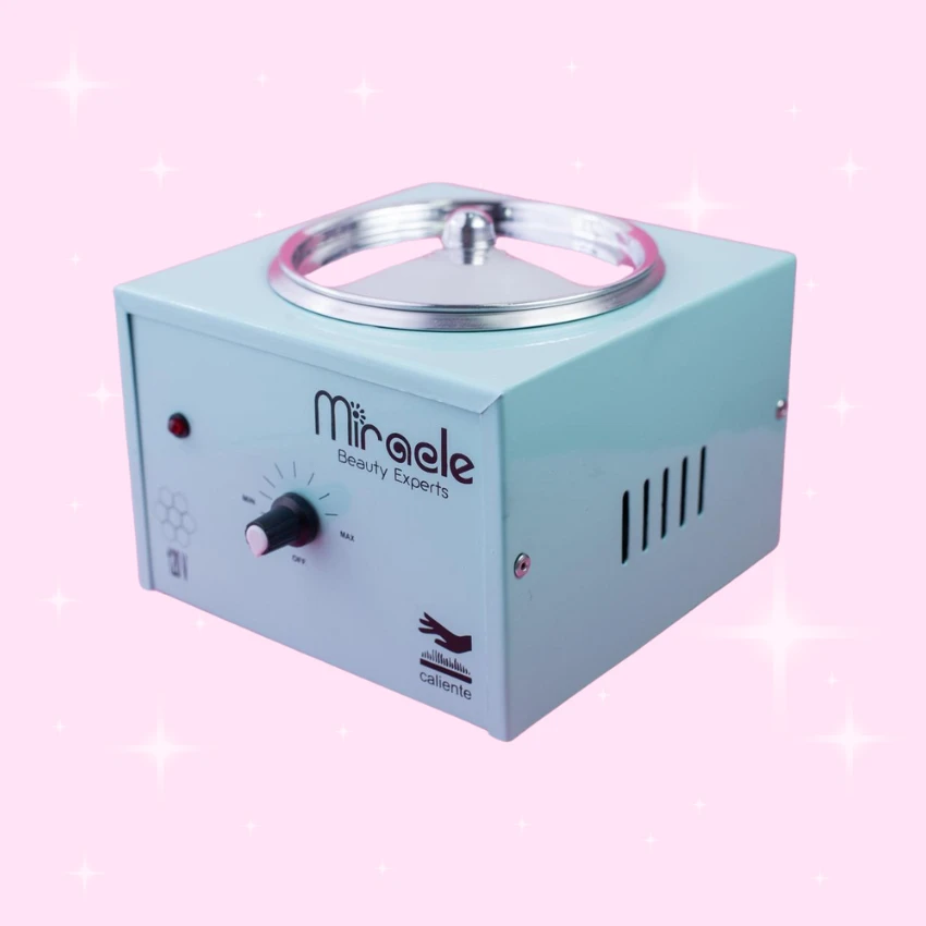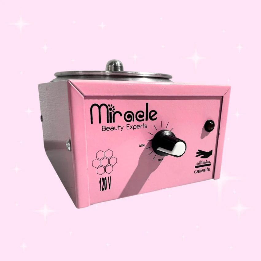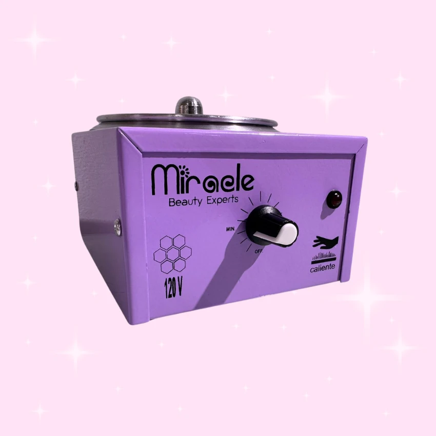 Calentador de cera compacto de 250ml, disponible en vibrantes colores lila, rosado y agua marina. Ideal para trabajos pequeños o retoques, manteniendo la cera a la temperatura perfecta para una depilación precisa.
