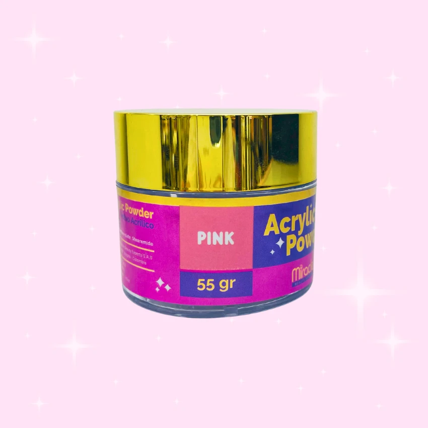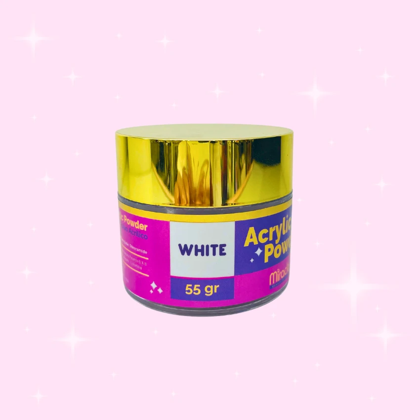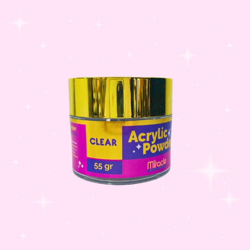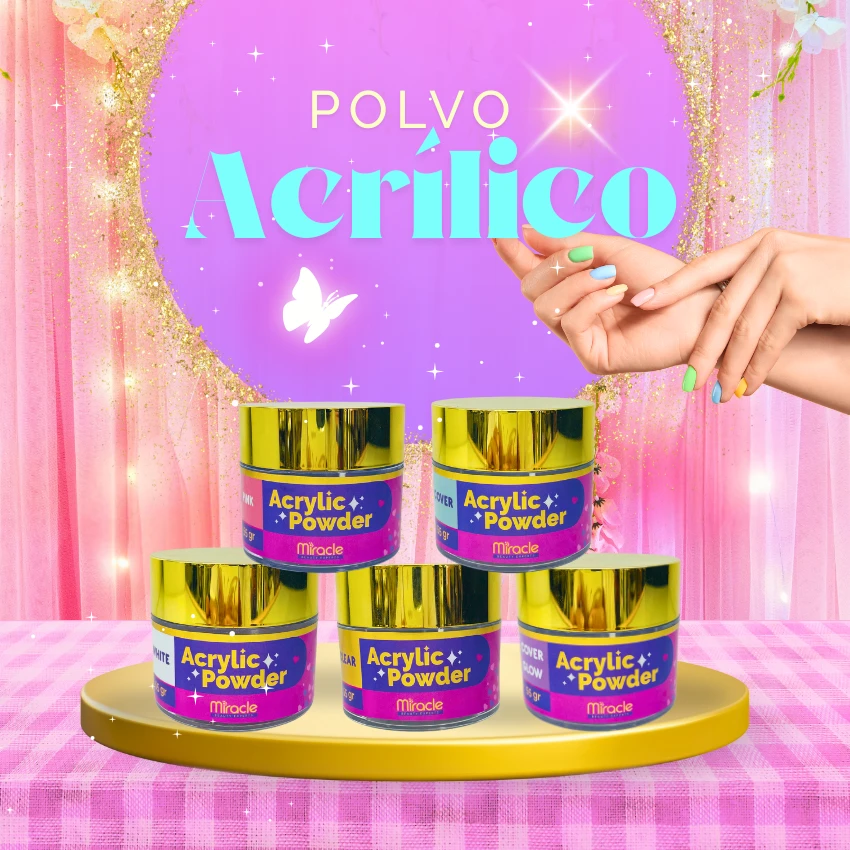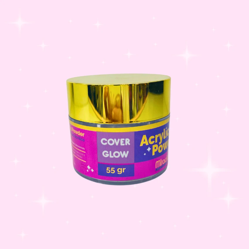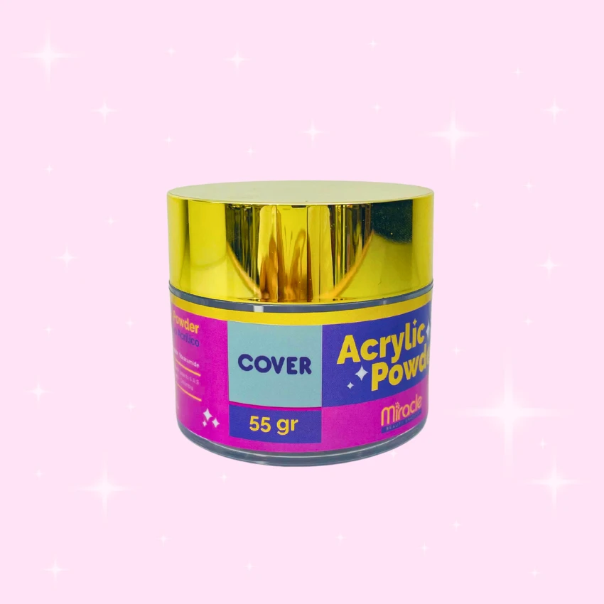 Polvo acrílico Miracle x 55 g en 5 tonos: Cover Glow, Cover, Clear, Pink y White. Alta adherencia, acabado profesional y presentación elegante para manicure.