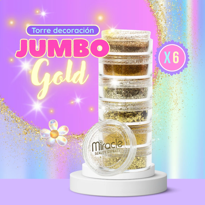 Set de polvos dorados para efectos elegantes y llamativos en uñas acrílicas, gel o semipermanentes. Su diseño en torre con 6 niveles facilita el almacenamiento y acceso rápido a cada tono.